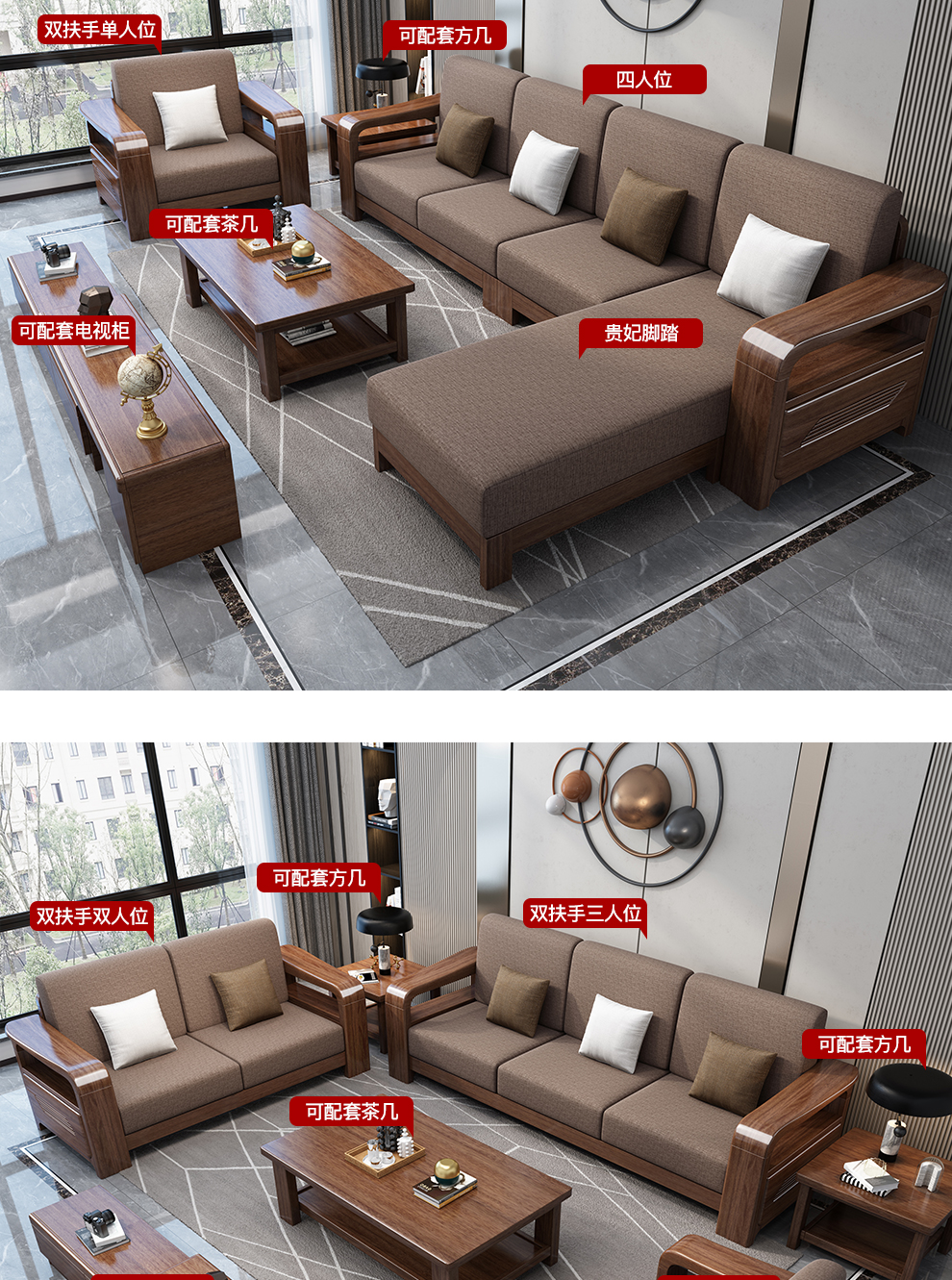 聯匠ソファ現代中国式胡桃木の実木ソファセット、新中国式実木の布芸ソファサイズの部屋型リビングルーム家具の科学技術布-シングル+ツイン+三人+茶何+方6801スプリングゴムシートのカバン
