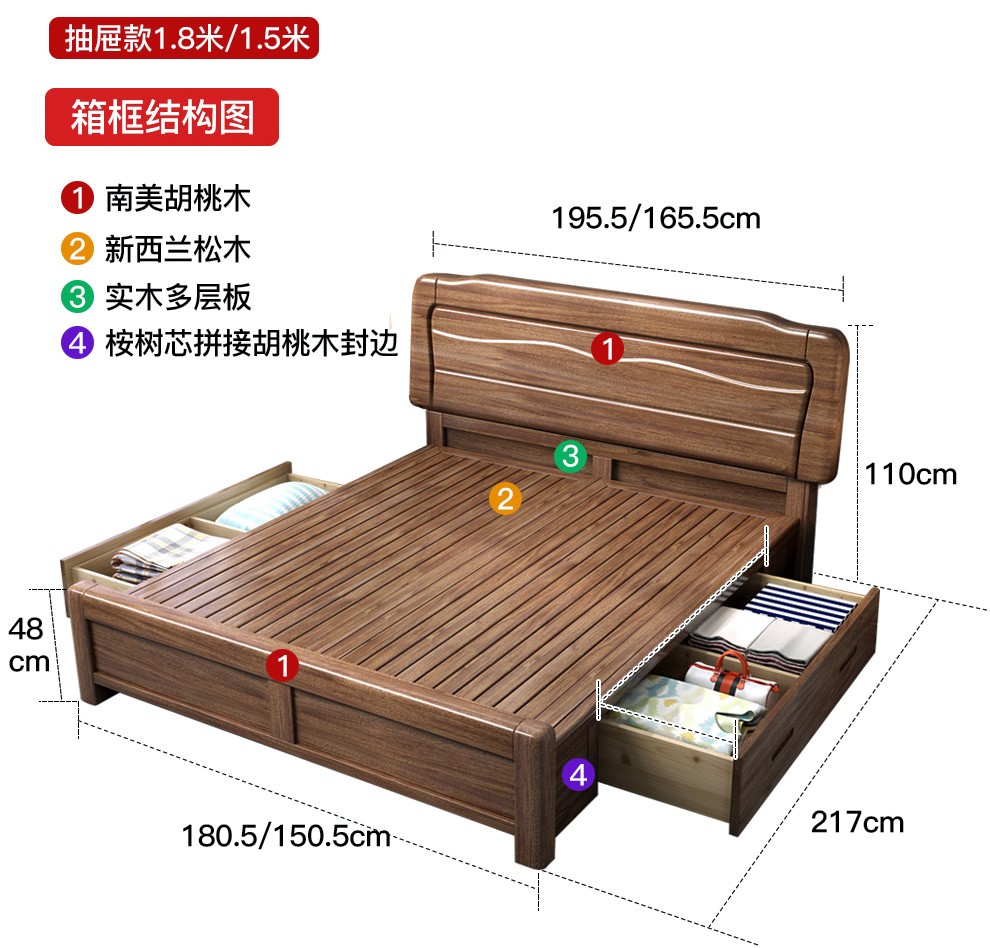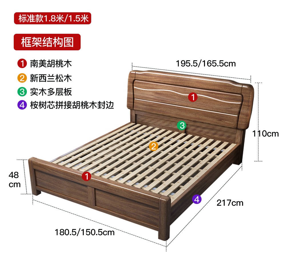 現代中国式の木製ベッド胡桃木床1.8 mダブルベッドの主な臥床現代中国式寝室家具シングルベッド+2台+589-5 Dラテックスマットレス(ソフトで快適)高箱タイプ【1.8 m*2.0 m】
