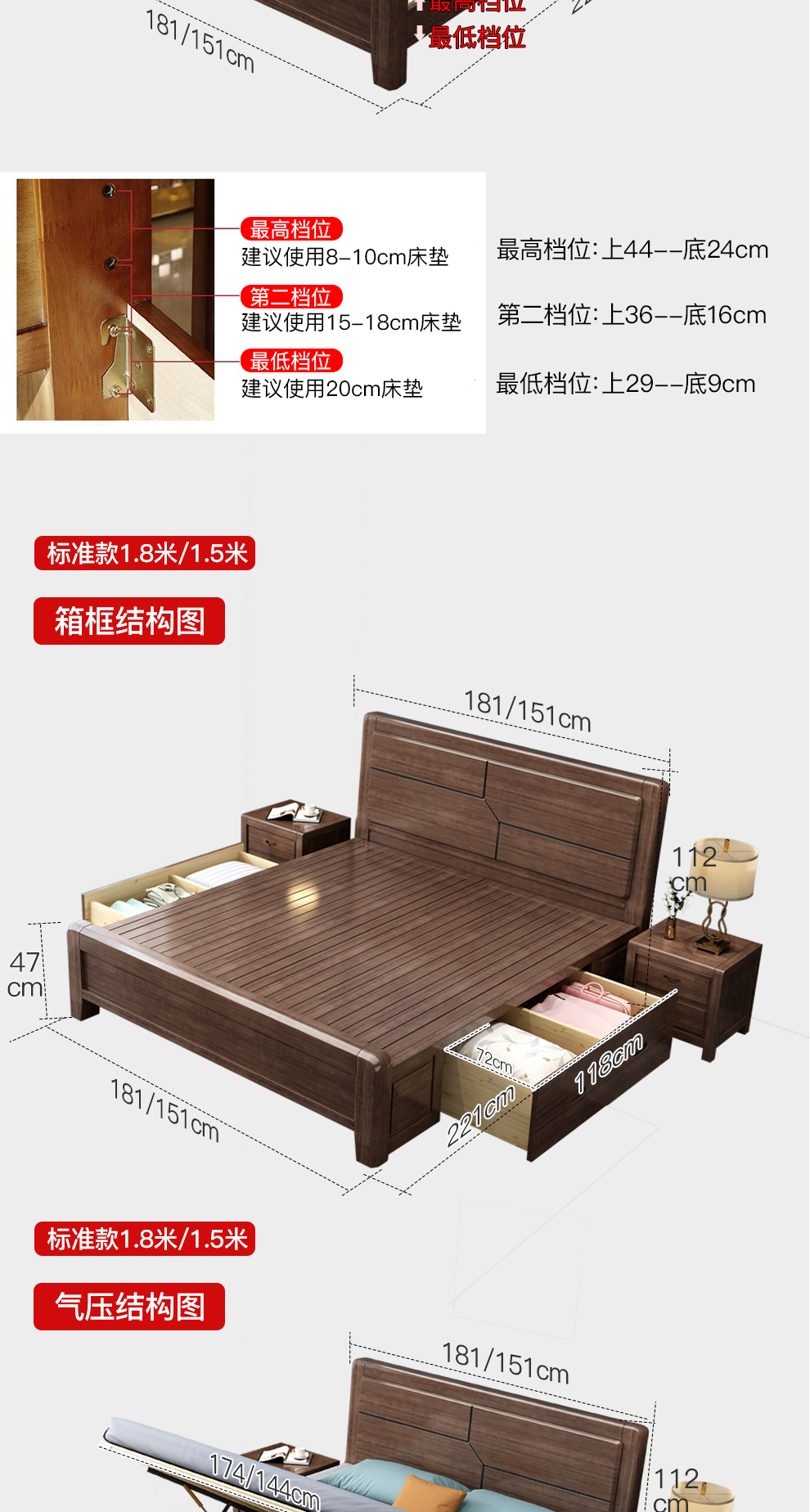 聯匠ベッド現代中国式胡桃木床1.5/1.8メートルダブルベッド結婚ベッド、新中国式実木ベッド高箱収納セットセットセット寝室家具ベッド+2箱+8011九分区ラテックスパッド(ハード両面)引き出しタイプ