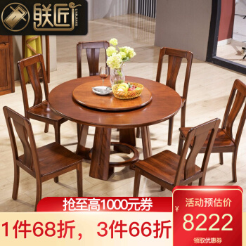 联匠食卓胡桃木圆餐台实木餐テーブルとテーブルセット現代中国式家具円形家庭用食卓+回転盤+6椅子1.35 m【写真価格ブランド見積】-京東